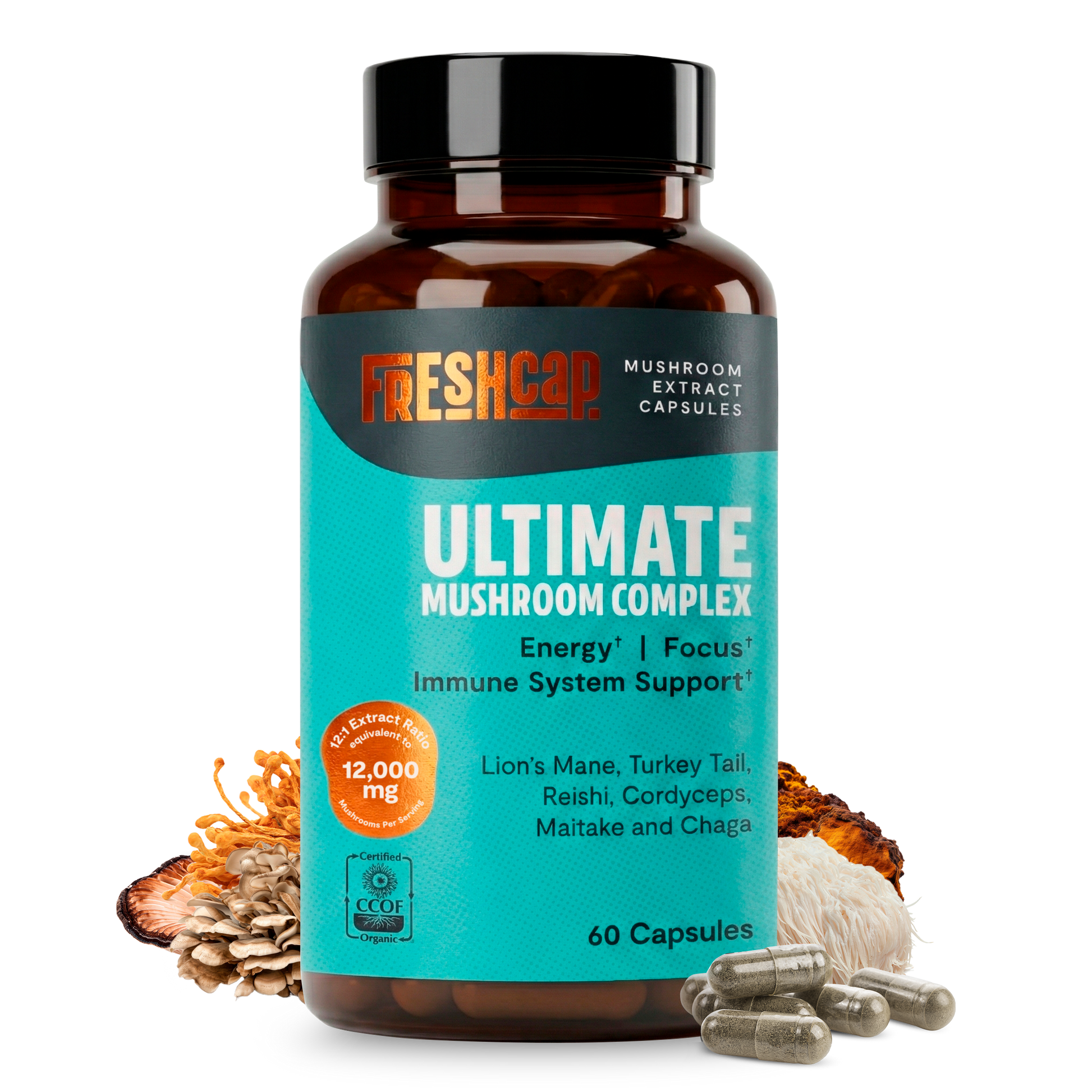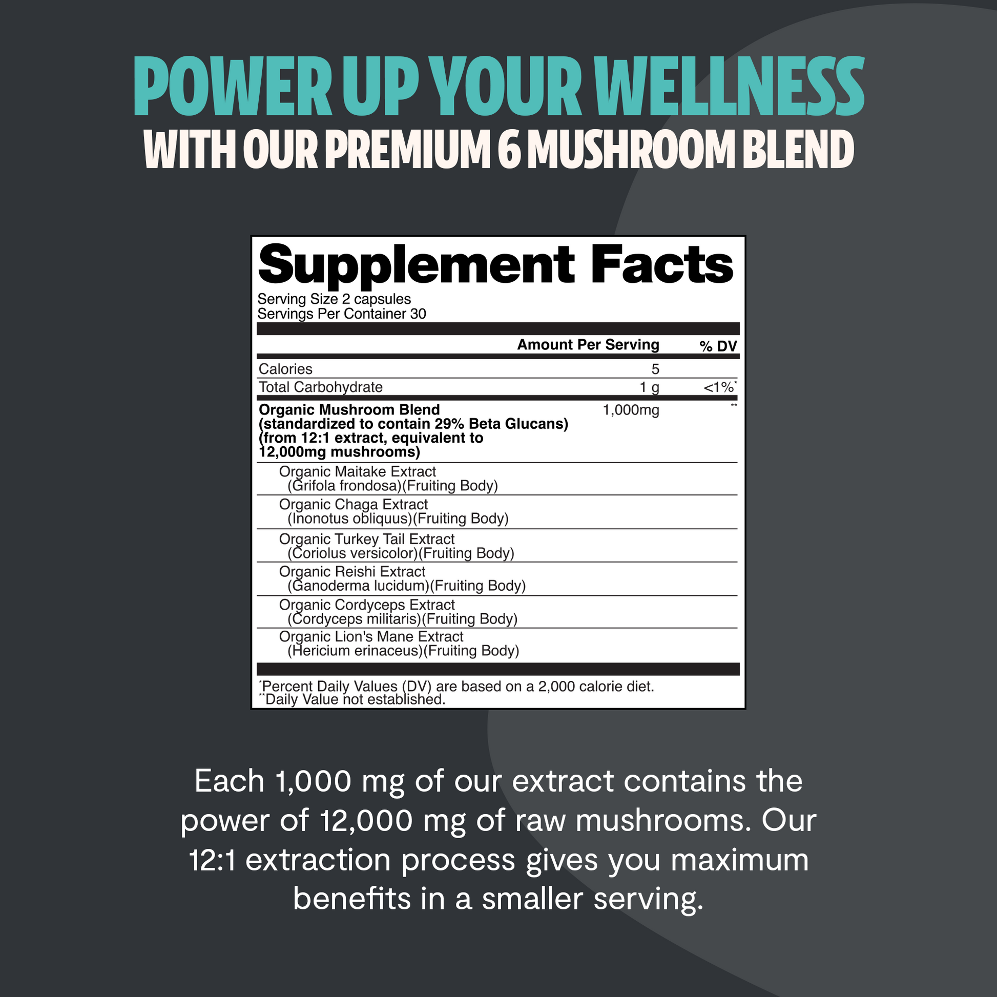 Premium blend of six powerful mushrooms for complete wellness. Quadruple-extracted mushroom supplement for maximum potency, delivering 12,000mg power for immunity, focus, and vitality.